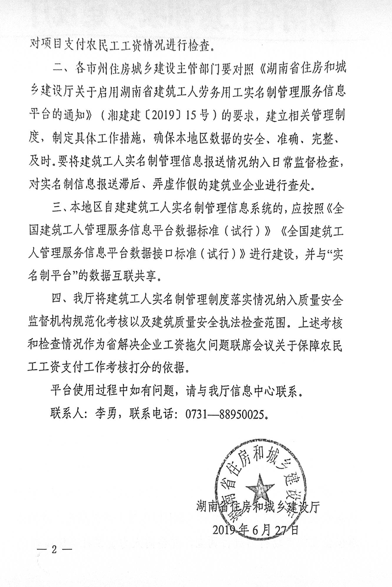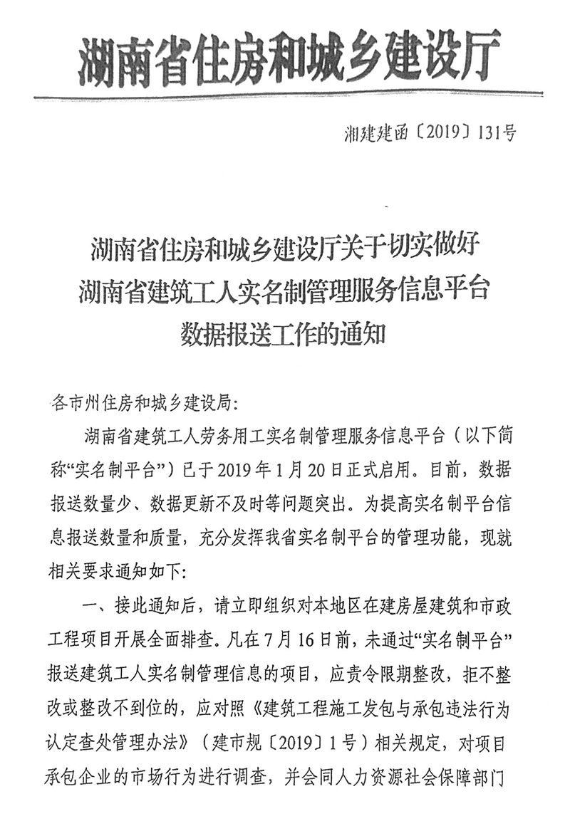 關于切實做好湖南省建筑工人實名制管理服務信息平臺數(shù)據(jù)保送工作的通知